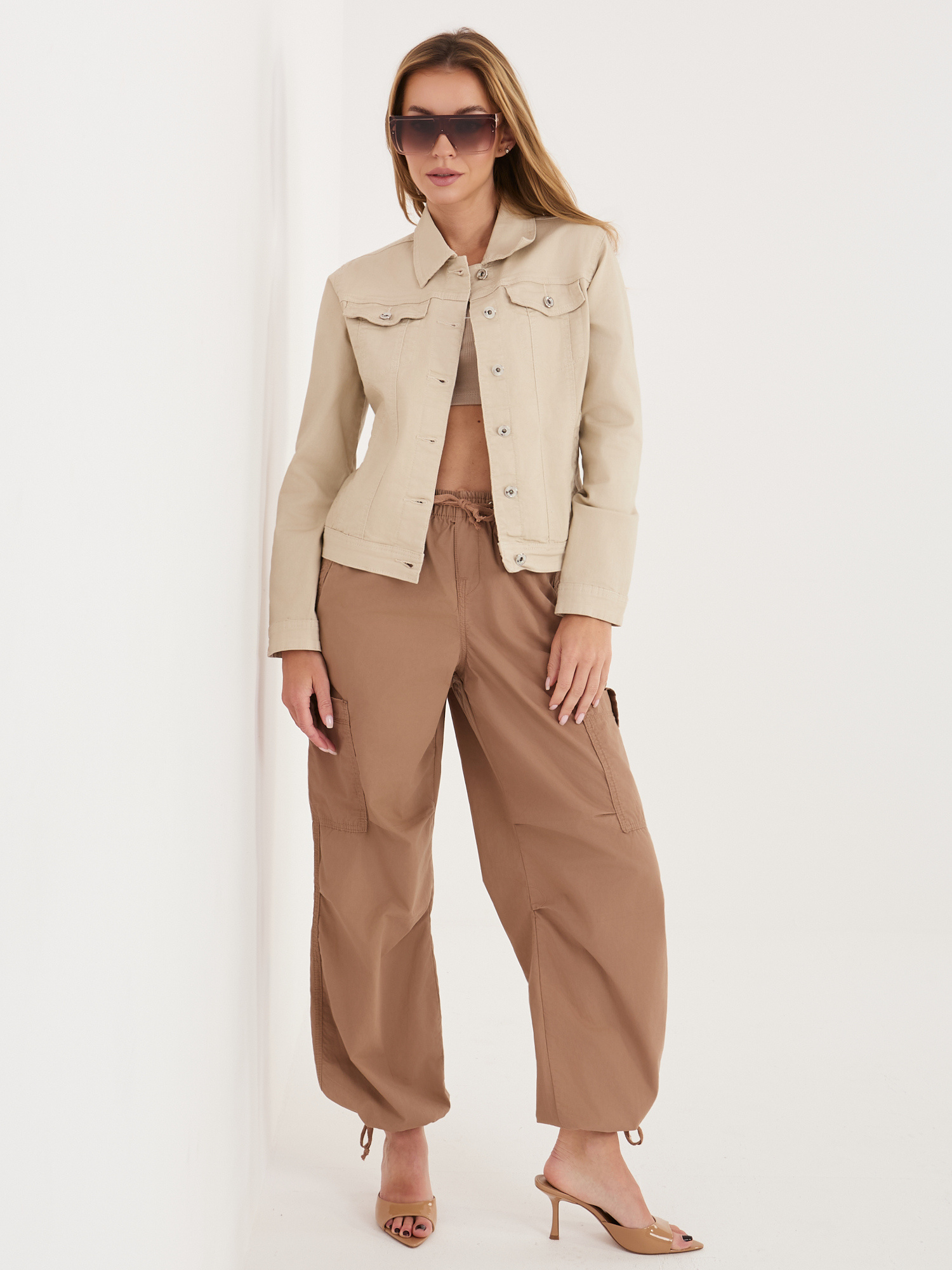 Beżowa jeansowa kurtka o dopasowanym kroju .