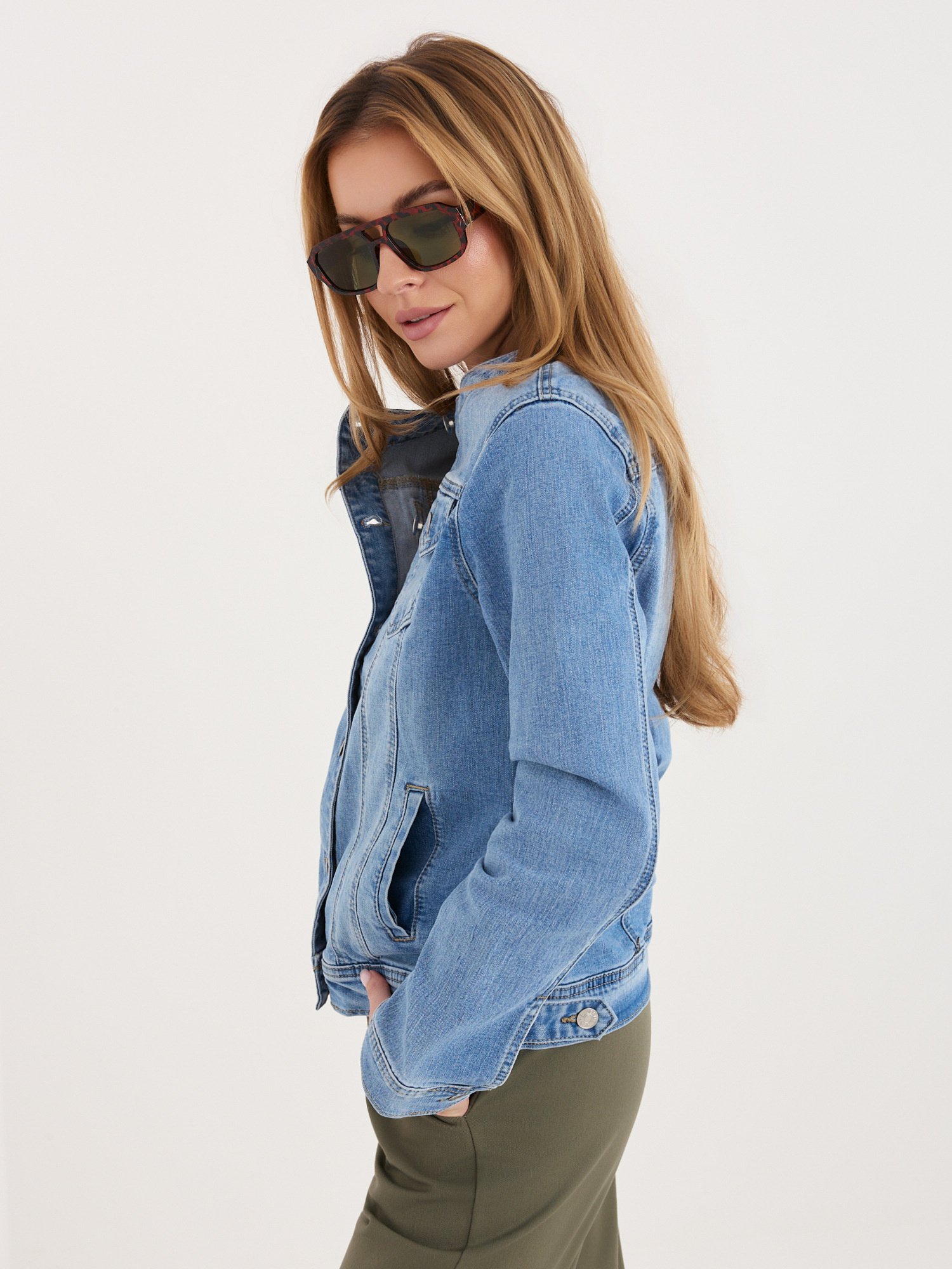 Niebieska jeansowa kurtka z okrągłym dekoltem .