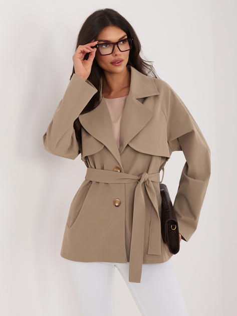 Ciemnobeżowy dwurzędowy płaszcz z paskiem RUE PARIS .