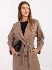 Ciemnobeżowy skórzany płaszcz z paskiem RUE PARIS