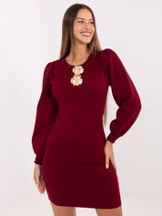Bordowa dzianinowa sukienka ze złotymi broszkami