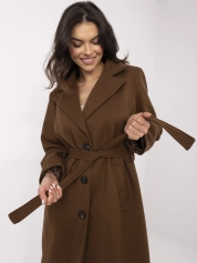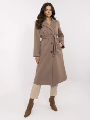 Ciemnobeżowy długi płaszcz damski z paskiem