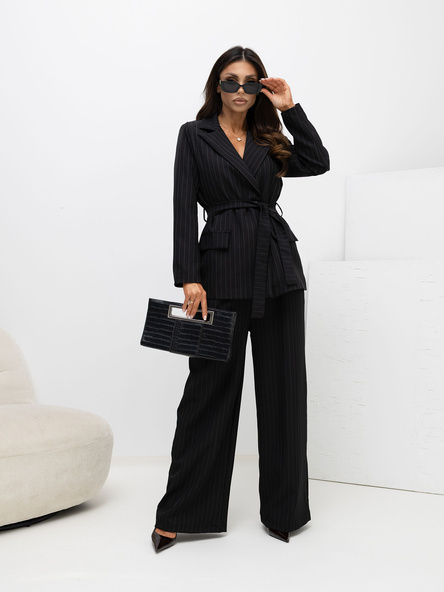 Czarny damski garnitur z wiązanym paskiem
